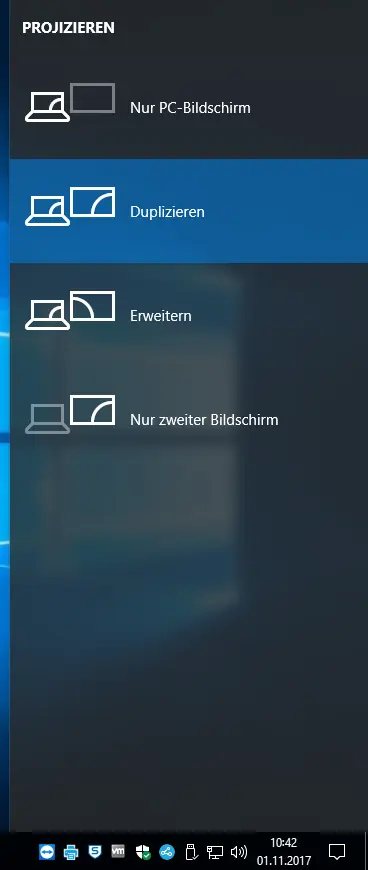 Die an dieser Stelle zur Verfügung stehenden Auswahlmöglichkeiten ("Nur PC-Bildschirm", "Duplizieren", "Erweitern" und "Nur zweiter Bildschirm") sprechen für sich.