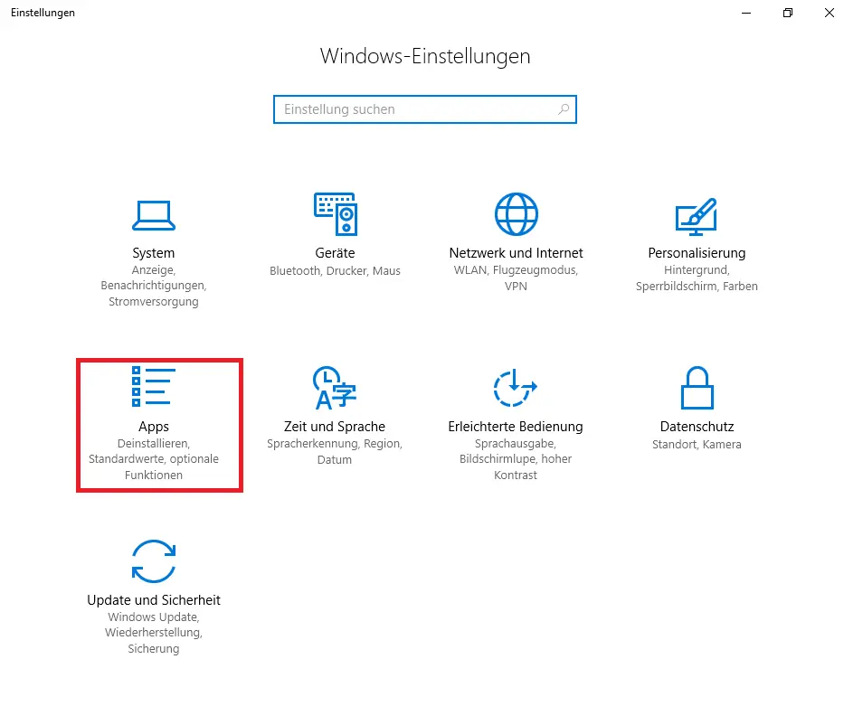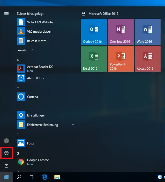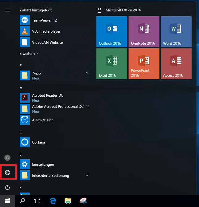 1. Öffnen der Windows Einstellungen über Start -> Einstellungen (Rädchen in Bild 1)