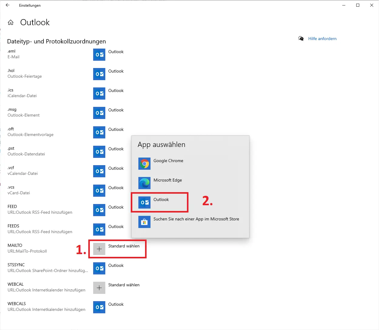 Wenn man einer App generell alle verfügbaren Standards zuweisen möchte, kann man das über "Standardeinstellungen nach App festlegen" vornehmen. So lassen sich bspw. Outlook alle Mail-spezifischen Standards zuweisen (Bild 6, 7).