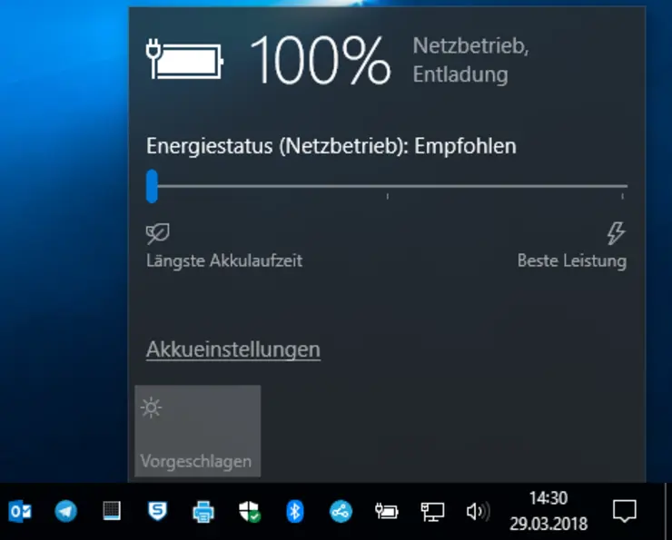 Bei Notebooks gibt es eine einfache Möglichkeit die Leistung und somit den Energieverbrauch einzustellen. Sobald man auf das Akkusymbol in der Taskleiste klickt erscheint der Schieberegler für die Energieeinstellungen (Bild). Die Bezeichnungen sind selbsterklärend, können aber je nach Gerätetyp unterschiedliche Auswirkungen haben. Es empfiehlt sich bei Notebooks immer den empfohlenen Wert bzw. die Einstellung für die längste Akkulaufzeit einzustellen. Sollte man doch mal mehr Leistung benötigen, kann man den Regler entsprechend umstellen. Eine empfohlene bzw. niedrige Einstellung hat unter anderem die Auswirkung, dass der Prozessor nicht dauerhaft mit voller Leistung läuft sondern nur wenn angefordert. Dies hat zusätzlich den Vorteil, dass das Gerät nicht so heiß wird und auch der Lüfter, insofern vorhanden, nicht so oft oder gar dauerhaft läuft.