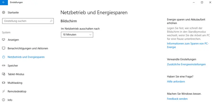 Der Bildschirm schaltet sich per Standard nach 10 Minuten aus. Dabei wird aus Datenschutzgründen gleichzeitig der Computer gesperrt. Diese Zeit lässt sich in den Windows-Einstellungen unter "System" -> "Netzbetrieb und Energiesparen" ändern oder durch Auswahl von "Nie" ganz abschalten (Bild).