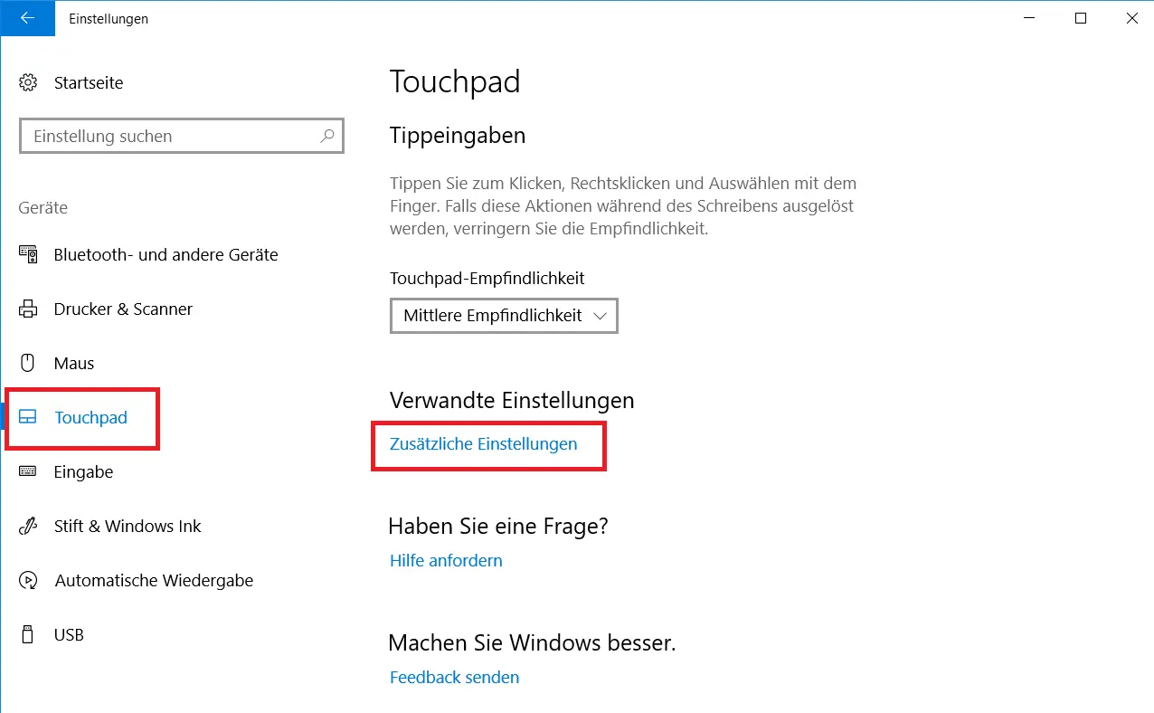 1. Gehen Sie unter "Start" -> "Einstellungen" -> "Geräte" auf die Rubrik "Touchpad" und klicken Sie auf "Zusätzliche Einstellungen".