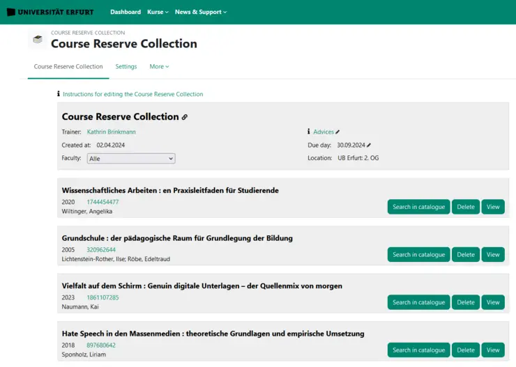 With the activity „Course reserve collection“, literature can be made available digitally in the Moodle course room and/or physically in the library. The literature can be imported directly from the online catalogue, futher instructions are linked above the activity.