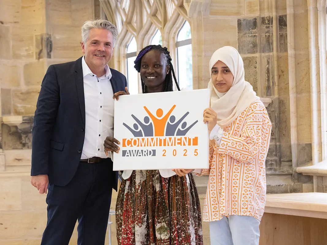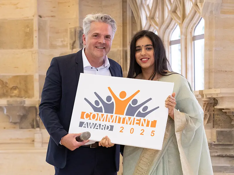 Professor Bettina Rockenbach, President of the German National Academy of Sciences Leopoldina, was among the first well-wishers that afternoon. In this year's Brandt Lecture, she had previously spoken about the question of how free science is in times of geopolitical upheaval. Of course, congratulations also came from the numerous guests in the Collegium Maius, the university lecturers and fellow students. Professor Andreas Goldthau, Director of the Brandt School: "We are very proud of our students, because it takes courageous and inspiring people to change the world one step at a time."