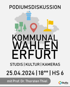 On 26 May 2024, local elections will be held in Erfurt (and throughout Thuringia). The start of a series of important elections. The Student Council of the University of Erfurt therefore invited six candidates from democratic parties to discuss perspectives and ideas for Erfurt as a university city on 25 April. I had the great pleasure of moderating the discussion and learning a lot about Erfurt and political engagement. Melissa Butt (SPD), Anna Altstädt (Mehrwertstadt), Erik Limburg (Piraten-ÖDP), Jasper Robeck (Grüne), Lilli Fischer (CDU) and Julian Degen (Linke) had a very lively, tough but always respectful discussion. And especially good and important: the lecture hall was absolutely packed, despite more than two hours of discussion. Thanks to everyone who made this possible. Poster