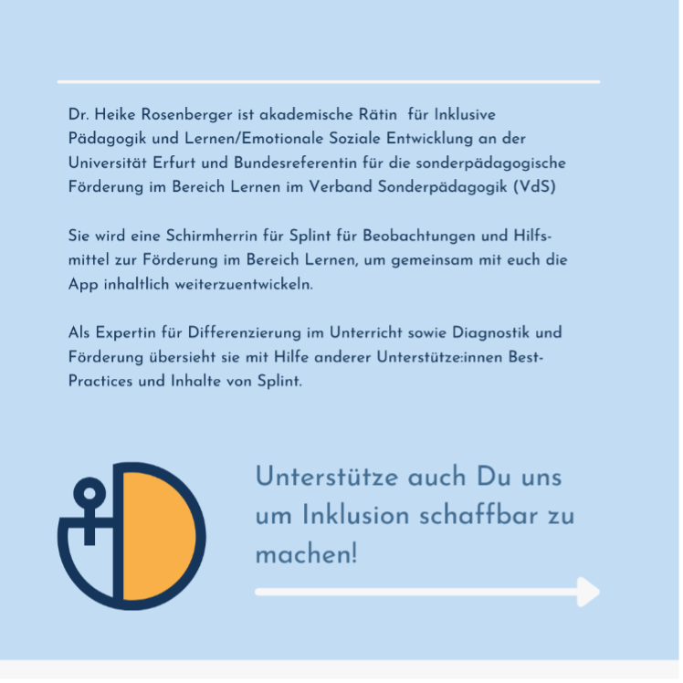 Bei der App Splint handelt es sich um eine praktische Hilfe für den inklusiven Unterricht, die durch die Inklusion-Digital GmbH (Berlin) entwickelt wurde. Lehrer*innen können mit Hilfe von Splint situations- und bedarfsgerecht auf Vorschläge zur individuellen Förderung von Schüler*innen mit besonderem Förderbedarf in den Bereichen Lernen, emotionale und soziale Entwicklung sowie Kognition perspektivisch in allen schulisch relevanten sonderpädagogischen Förderschwerpunkten zurückgreifen.