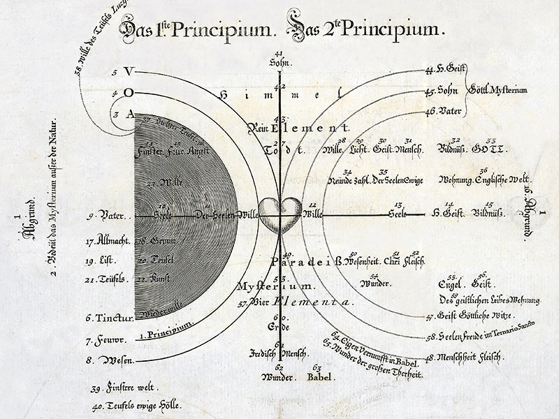 Abbildung: Böhmes „Philosophische Kugel", aus: "Viertzig Fragen von der Seele", in: Jacob Böhme. Alle Theosophischen Werke. 1730 [1682]. FBG, BW 25620.955-3.