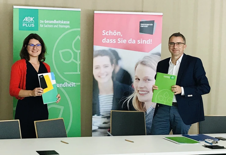 Until 2023, AOK PLUS will support the University of Erfurt in developing its occupational health management system. Alexandra Krumbein, Regional Managing Director of AOK PLUS, and Dr Jörg Brauns, Head of Administration of the University of Erfurt, signed a corresponding cooperation agreement in July 2020.