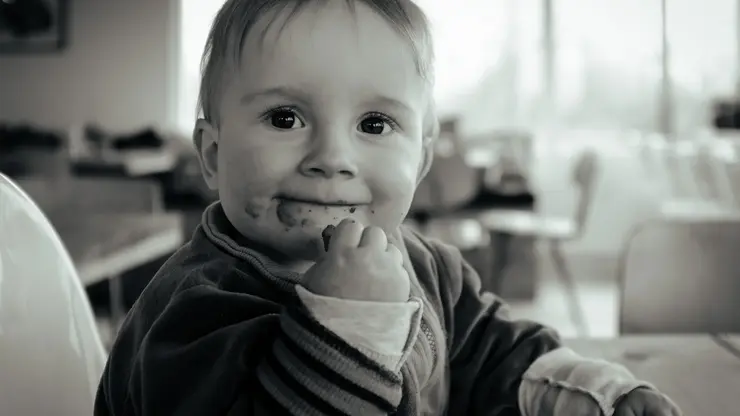 [Translate to English:] Ein Kleinkind sitzt in einem Hochstuhl