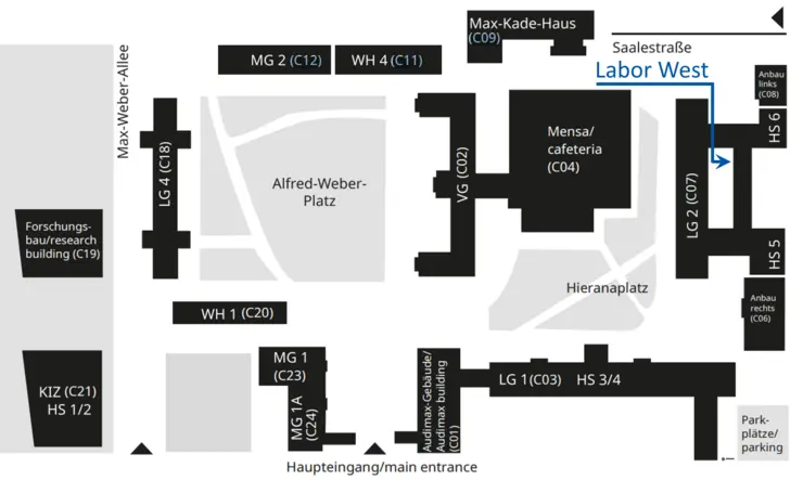 Im Labor West stehen 25 Computerkabinen zur Verfügung, die durch Vorhänge geschlossen werden können. Jede Kabine ist mit einem Computerarbeitsplatz ausgestattet. Zusätzlich steht ein separater Raum mit zwei Computerarbeitsplätzen für die Steuerung und Beobachtung der Befragungssoftware zur Verfügung.