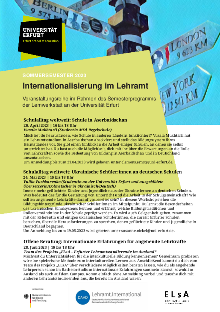 Studierenden in den Lehramtsstudiengängen, die Interesse daran haben, einen Teil ihres Bachelor- und/oder Masterstudiums im Ausland zu absolvieren, steht ein umfangreiches Beratungsangebot zur Verfügung. In enger Zusammenarbeit mit dem Internationalen Büro der Universität Erfurt, das über Finanzierungsmöglichkeiten von Auslandsaufenthalten informiert, erfolgt die gesamte studienorganisatorische Beratung durch das Projekt ELsA an der Erfurt School of Education.