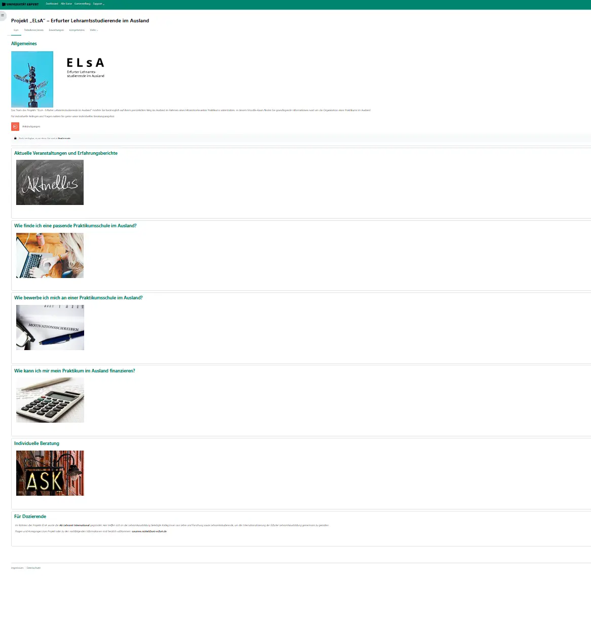 Das Projekt „Erfurter Lehramtsstudierende im Ausland“ nutzt Moodle als Kommunikationsplattform, um interessierten Studierenden sowie Dozierenden Informationen zu Internationalisierungsmaßnahmen und -möglichkeiten zur Verfügung zu stellen.
