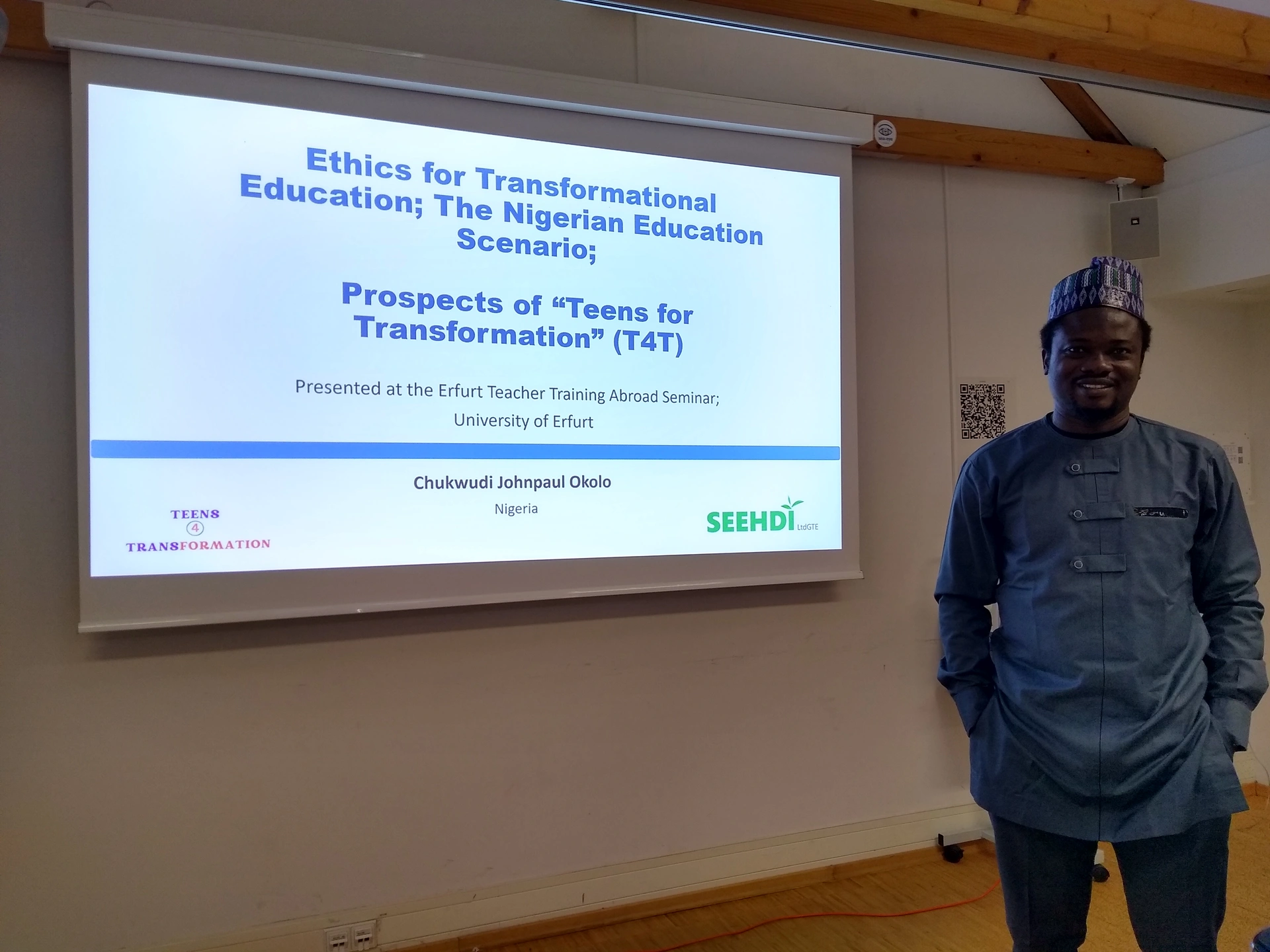 Chudi Okolo, Absolvent der Universität Erfurt, stellte das Bildungssystem aus seinem Heimatland Nigeria vor und beleuchtete dabei vor allem die Themen Werteerziehung, Ethik und Moral im Kontext der nigerianischen Gesellschaft. Er stellte sein Projekt „Teens for Transformation“ vor, für das er den Globethics.net Hackathon Award 2021 gewonnen hat. Ziel des Projekts ist die Etablierung von Ethik Clubs an Schulen in Nigeria nach dem Prinzip des Peer Learnings.