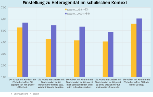 „Das Seminar zielt darauf ab, Differenzierung grundlegend und in verschiedenen Formen und Methoden der Didaktik, Unterrichtsorganisation und Klassenmanagement kennen zu lernen und diese zu reflektieren“, fügte Christian Schinköthe an und ergänzt, dass es sich geradezu anbietet, die Heterogenität einer inklusiven Unterrichtssituation als Grundlage zu nutzen. Die Teilnehmer der Gesprächsrunde waren sich einig, dass die durch das Team-Teaching-Format entstandenen unterschiedlichen Perspektiven auf die im Seminar bearbeiteten Themen sowohl für Studierende als auch für Dozierende ein Gewinn sind. Cedric Steinert unterstrich die positiven Effekte des Team-Teaching auf das Seminar: „Im Team-Teaching ergänzen und addieren sich die Dozierenden in ihren spezifischen Kompetenzen, so dass sie das Lernen der Studierenden optimal unterstützen; gleichzeitig können die jeweiligen Stärken in gegenseitiger Verständigung gezielt eingesetzt werden“. Zugleich wurden die praktischen Erfahrungen, die Herr Steinert als Sonderpädagoge mitbringen konnte, für den Prozess der Auseinandersetzung mit Inklusion als sehr fruchtbar wahrgenommen. „Durch die Zusammenarbeit mit dem Kompetenzzentrum ist Inklusion keine zusätzliche, isoliert besprochene Thematik im Seminarkonzept, es ist nun ein mit allen Seminarinhalten verzahnter und ergänzender Sachverhalt. Für mich war es von substanziellem Vorteil, dass Herr Steinert eine inklusionspädagogische Perspektive und seine Expertise ins Seminar einbringen konnte, da so bei Fragen der Studierenden in puncto Inklusion ein kompetenter Ansprechpartner vor Ort war, was mich gleichzeitig entlastete.“, fasst Frau Dr. Nancy Quittenbaum das Ergebnis der Kooperation zusammen. Zudem nimmt sie aufgrund des kontinuierlichen Dialogs über Inklusion und Heterogenität die Entwicklung wahr, dass Studierende „Ängste und Sorgen verlieren, deutlich weniger problematisieren und Schritt für Schritt offener, aufgeschlossener und affirmativ mit der Thematik umgehen“. Dies ist sowohl übereinstimmend mit den Rückmeldungen der Studierenden in Gruppeninterviews als auch mit den ersten Ergebnissen der begleitenden Seminarevaluation (s. Abb.), welche mit Fragebögen zur Selbsteinschätzung im Prä-Post-Design erfolgte. Die Ergebnisse zeigen auch, dass sich Studierende in Bezug auf Gemeinsamen Unterricht kompetenter in der Anwendung konkreter Methoden fühlen, zudem über gegenständlicheres Wissen über Möglichkeiten der Differenzierung in inklusiven Settings verfügen und gleichzeitig ihre eigenen Fähigkeiten professioneller und realistischer reflektieren können. „Die Erkenntnis seitens der Studierenden, dass in der Unterrichtspraxis keine homogene Klasse existiert und sich Lehrerprofessionalität dadurch auszeichnet, Methoden sinnvoll und begründet auszuwählen, um dieser Heterogenität gerecht zu werden, ist grundlegend für die spätere Arbeit der Studierenden im Gemeinsamen Unterricht.“, erklärt Christian Schinköthe.