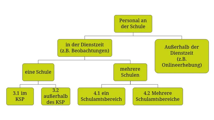 4.1 ein Schulamtsbereich: Genehmigung des zuständigen Schulamts, Zustimmung der Schulleitungen und Zustimmung der Befragten; siehe Hinweisblatt 2