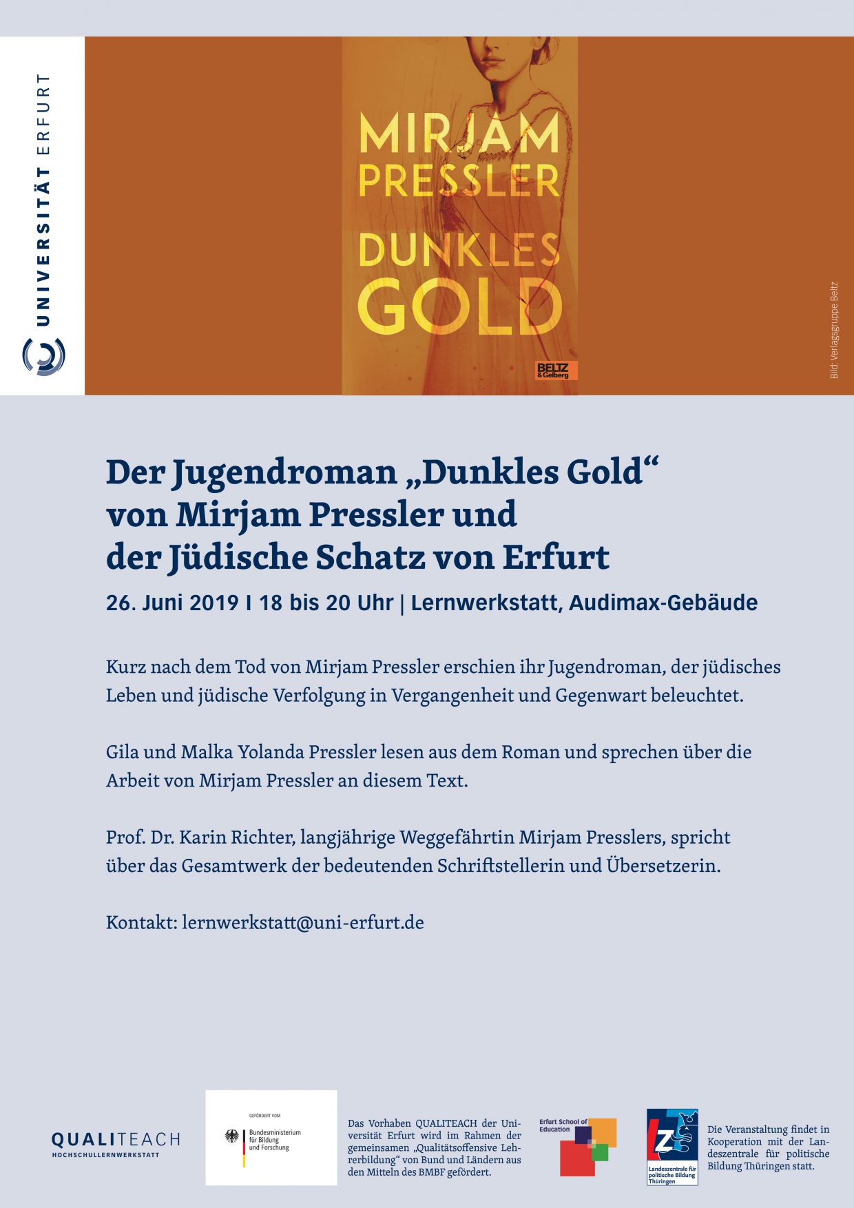 Kurz nach dem Tod der bedeutenden Kinder- und Jugendbuchautorin und Übersetzerin Mirjam Pressler ist im März 2019 der Jugendroman „Dunkles Gold“ erschienen, der auf zwei Ebenen die Geschichte des jüdischen Schatzes von Erfurt erzählt.
