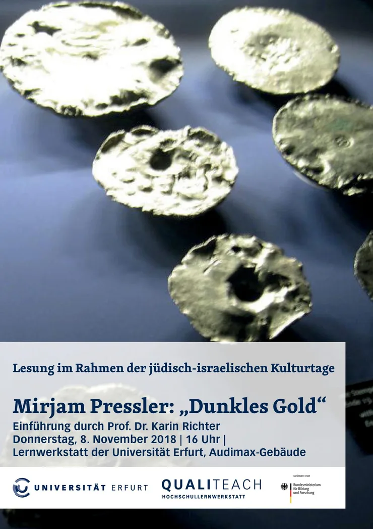 Einen Höhepunkt im Veranstaltungsprogramm der Lernwerkstatt im Wintersemester 2018/2019 stellte die Lesung mit der bekannten Kinder- und Jugendbuchautorin Mirjam Pressler dar. Im Rahmen der jüdisch-israelischen Kulturtage las Mirjam Pressler am 08.11. aus dem Manuskript ihres Jugendromans “Dunkles Gold”, der im Frühjahr 2019 erscheinen wird. In dem Buch geht es um den Erfurter Schatz, der höchstwahrscheinlich während des Progroms von 1349 vergraben wurde und 1998 im Zuge archäologischer Untersuchungen unweit der Alten Synagoge unter der Mauer eines Kellerzugangs wiederentdeckt wurde. Das Buch verbindet Ereignisse jüdischen Lebens im Mittelalter mit dem gegenwärtigen Umgang mit jüdischer Kultur, Religion und Geschichte.