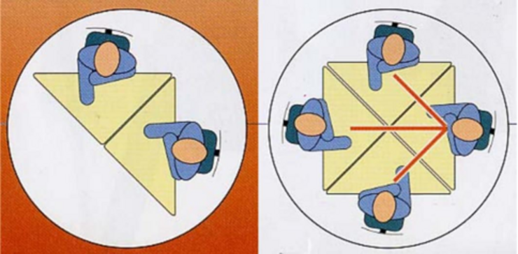 Das Zauberwort ist "ergonomische Gestaltung des Schulmobiliars". Jedem/r einzelnen Schüler_in muss ein Stuhl und ein Einzeltisch bereitgestellt werden, welchen er/sie seiner/ihrer Körpergröße anpassen kann. Dies fördert nicht nur die Gesundheit, sondern auch das Lernklima in der Klasse. Bewegungen der Kinder werden durch dynamische Sitzflächen und Rückenlehnen ermöglicht, die ein leicht federndes Wippen nach hinten ermöglichen. Außerdem wird der Lernablauf bzw. Lernfortschritt innerhalb der Klasse gefördert, mithilfe von dreieckigen Tischen, welche man nach Belieben zu Gruppentischen oder zu Einzeltischen stellen kann. Aber auch Stehtische oder Liegeflächen sind notwendig, sodass jede_r für sich entscheiden kann, wie er arbeitet.