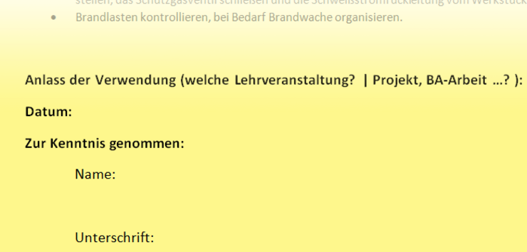 Die Studierenden müssen sich vor der Arbeit informieren und die Sicherheitsbelehrung unterschreiben.