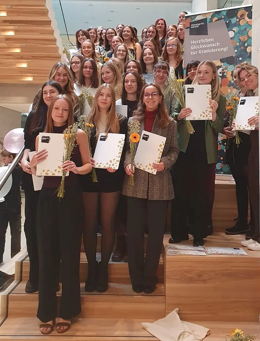 Mit Blick in die Zukunft hoffen wir, dass viele der Absolventinnen und Absolventen der Universität Erfurt weiterhin verbunden bleiben – sei es in Forschung, Praxis oder Lehre. Ebenso wünschen wir uns, dass sich auch im kommenden Jahr engagierte Studierende finden, die diese schöne Tradition fortführen. Ein besonderer Dank gilt an dieser Stelle Frau Laura Ragab, Masterstudentin der Psychologie und selbst Absolventin des Bachelorstudiengangs an der Universität Erfurt, deren großes Engagement und organisatorischer Einsatz die Durchführung der Feier erst möglich gemacht haben.