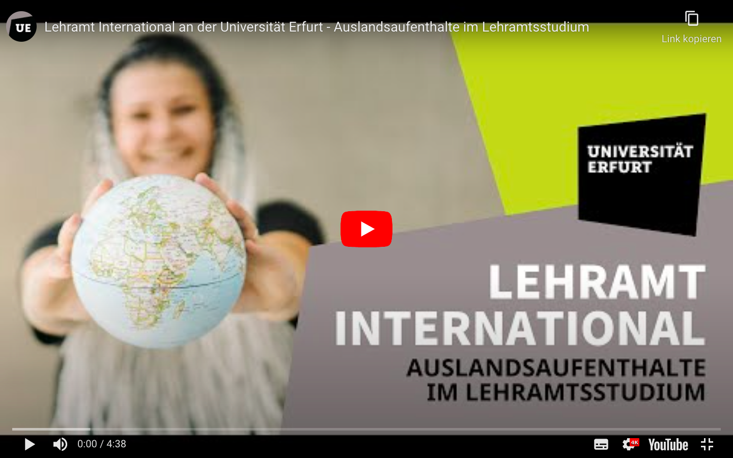 Internationale Auslandsaufenthalten im Lehramtsstudium spielen für die Universität Erfurt eine elementare Rolle. Daher hat die Erfurt School of Education unter der Mitarbeit von Sandra Neumann (ESE-Studiendirektorin) ein Video veröffentlicht, um Lehramtsstudierenden einen Aufenthalt im Ausland nahezulegen und die vielen Vorteile aufzuzeigen: