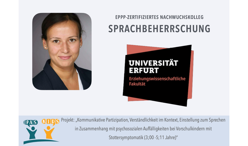 Juline Hagemann wurde mit Ihrem Promotionsprojekt PAS Kids in das Nachwuchskolleg "Sprachbeherrschung" aufgenommen. Das Projekt befasst sich mit der kommunikativen Partizipation, der Verständlichkeit im Kontext sowie der Einstellung zum Sprechen in Zusammenhang mit psychosozialen Auffälligkeiten bei Vorschulkindern mit Stottersymptomatik (3;00 -5;11 Jahre).