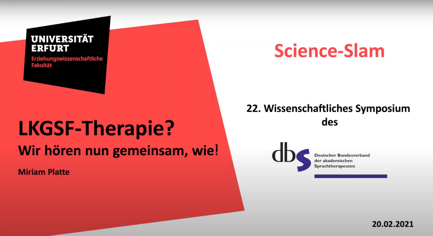 Im Rahmen des dbs-Symposiums fand auch in diesem Jahr wieder ein Science-Slam statt. Fünf Teilnehmerinnen stellten ihre Promotionsprojekte in drei Minuten mit drei Folien vor. Unter dem Titel „LKGSF-Therapie? Wie hören nun gemeinsam, wie!“ präsentierte Miriam Platte ihr Promotionsprojekt LKGSF-T E3 in Reimform. Mit dieser kreativen Darstellung sicherte sie ich den 1. Platz, der mit einem Preisgeld in Höhe von 200€ dotiert war.