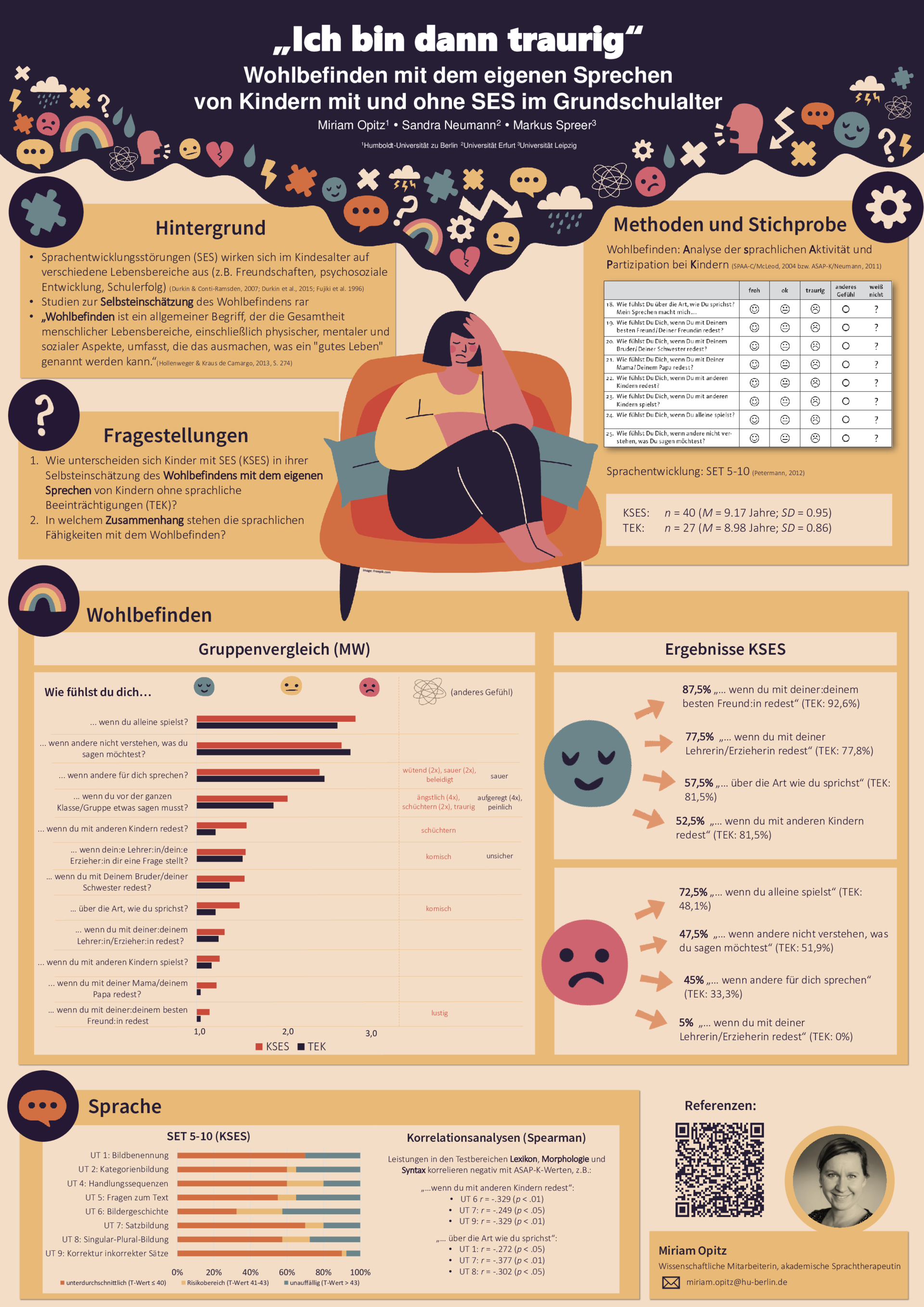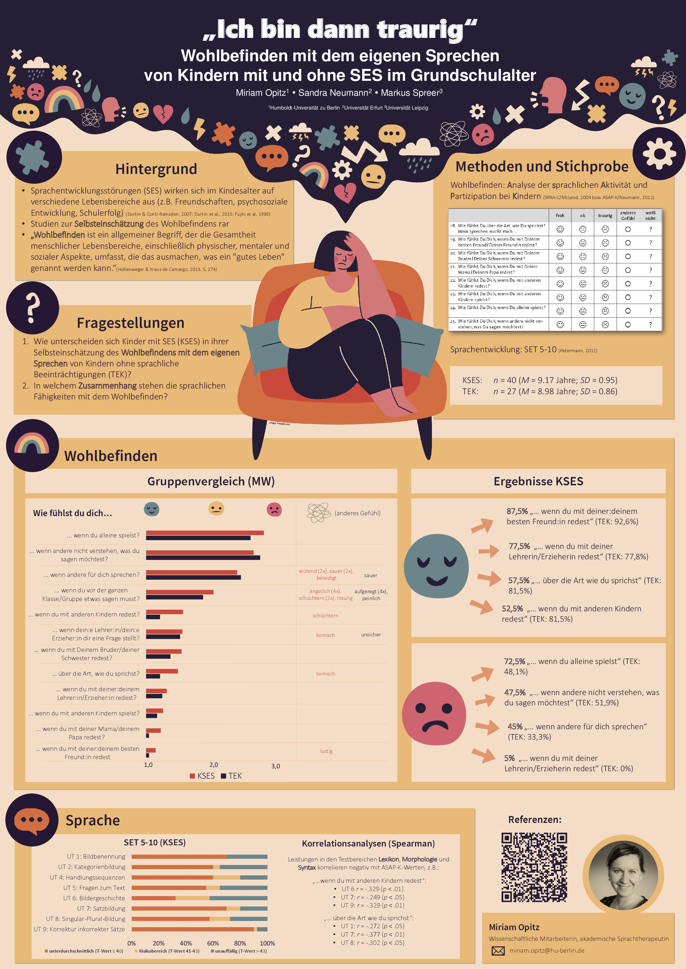 Opitz, M., Neumann, S. & Spreer, M. (2022, 25-26 November). "Ich bin dann traurig“ Wohlbefinden mit dem eigenen Sprechen von Kindern mit und ohne SES im Grundschulalter [Posterpräsentation]. 12. Interdisziplinäre Tagung über Sprachentwicklungsstörungen der GISKID e.V., Marburg, Deutschland.