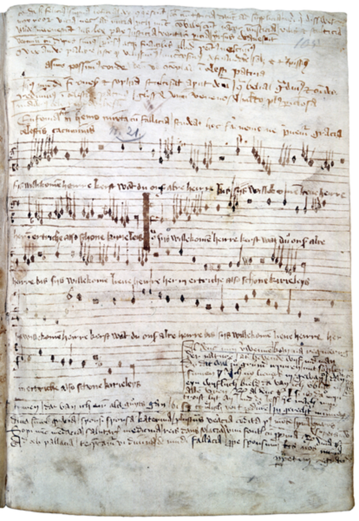 In einer der Handschriften aus dieser Sammlung, einem in England im 14. Jahrhundert entstandenen und von Amplonius wohl in Köln angekauften Codex Q 332, der vermischte gelehrte Schriften bewahrt, findet sich auf einem zuvor teilweise leer gebliebenen Blatt (fol. 105r) der in der eingangs zitierten Aachener Vorschrift nur angedeutete, hier vollständig überlieferte Text des deutschsprachigen Weihnachtsliedes, und zwar gleich dreifach nacheinander: Zunächst stehen zwei begleitende Oberstimmen, dann als Cantus Firmus die Unterstimme. In eine moderne Notation umgesetzt sind Text und Melodie so zu lesen (und singen!), wie es das beiliegende Notenblatt zeigt. Die „Bibliotheca Amploniana“ Erfurt, die 2012 die 600-Jahrfeier ihrer Stiftung feiern kann, bewahrt also den ältesten vollständigen Beleg für ein deutschsprachiges Weihnachtslied.