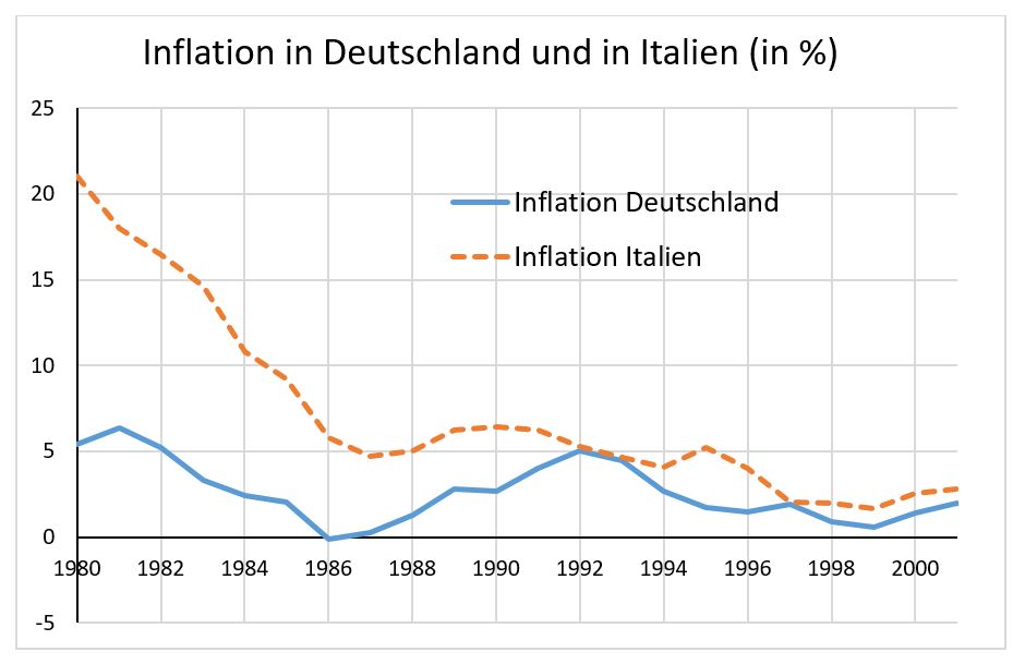 Vorbehalte gegen eine Einheitswährung wurden vor ihrem Start und auch in der Anfangszeit von Seiten der ökonomischen Wissenschaft artikuliert. Allgemein wurde darauf hingewiesen, dass eine gemeinsame Währung den einzelnen Ländern ein wichtiges Instrument aus dem makroökonomischen Werkzeugkasten nehme. Der Vorteil flexibler Wechselkurse zwischen nationalen Währungen sei, so das Argument, dass Länder mit unterschiedlichen Inflationsraten so koexistieren können. Unterschiedliche Inflationsraten sind nach dieser Sichtweise auch das Resultat unterschiedlicher nationaler Präferenzen in Sachen Arbeitslosigkeit und fiskalischer Strenge (sprich: gezügelte Staatsausgaben). Konkreter waren die Vorbehalte besonders von deutschen Ökonomen, die den sinkenden Einfluss der Deutschen Bundesbank voraussahen. Die Aufgabe der D-Mark, so war die Befürchtung, würde für Deutschland bedeuten, dass hierzulande die Inflation in Richtung der Werte im europäischen Ausland steigen würde. Dabei wurde oft die Inflationserfahrung von Italien als Schreckszenario angeführt. Ein Blick auf historische Daten macht das verständlich. Die untenstehende Grafik zeigt den Verlauf der deutschen und der italienischen Inflation über den Zeitraum von 1980 bis ins Jahr 2001. 1980 erreichte die italienische Inflation einen Höchstwert von über 20 Prozent im Jahr. Im Vergleich dazu stand die deutsche Inflation auf knapp über sechs Prozent. Die Befürchtung war nun, dass sich mit dem Übergang zu einer gemeinsamen Währung und einer gemeinsamen Geldpolitik die deutsche Inflation eher im Erfahrungsbereich der italienischen Werte bewegen könnte. Denn eines ist klar: Mit einer Gemeinschaftswährung gibt es nur noch eine gemeinsame Geldpolitik, und die nationalen Inflationsraten in den Ländern einer Währungsunion sind eng aneinandergekoppelt.