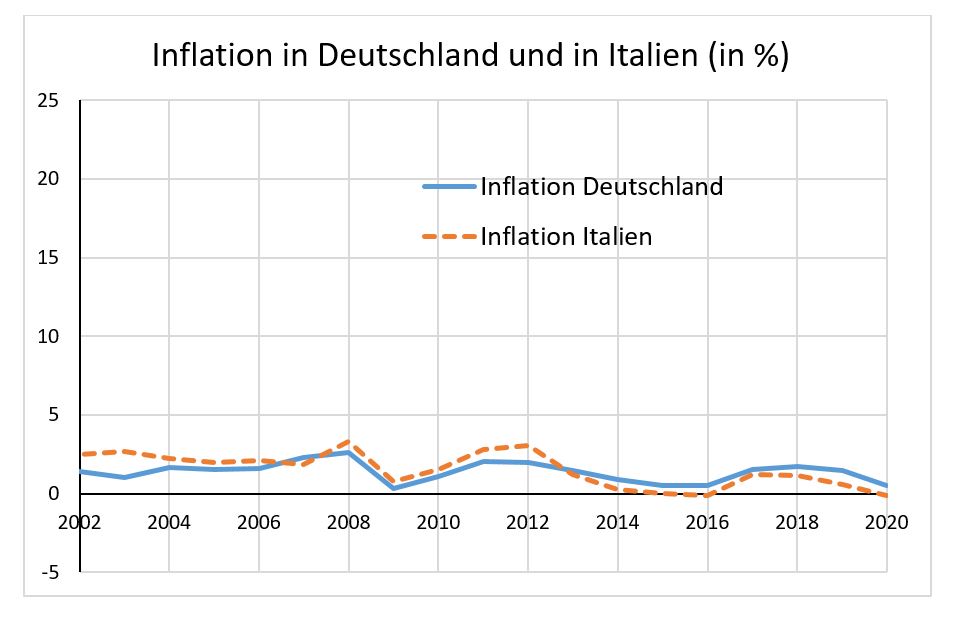 Wie die zweite Grafik unten dokumentiert, war die Furcht vor steigender Inflation jedoch lange unbegründet. In den Jahren von 2002 bis 2020 blieben sowohl die deutsche wie die italienische jährliche Inflation immer unter vier Prozent. Stützt damit die historische Entwicklung der Inflationsraten die Position der Euro-Optimisten? Von dieser Seite war nämlich argumentiert worden, die neue gemeinsame Geldpolitik würde allen beteiligten Ländern helfen, ihre Inflation niedrig zu halten.