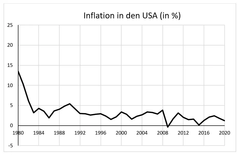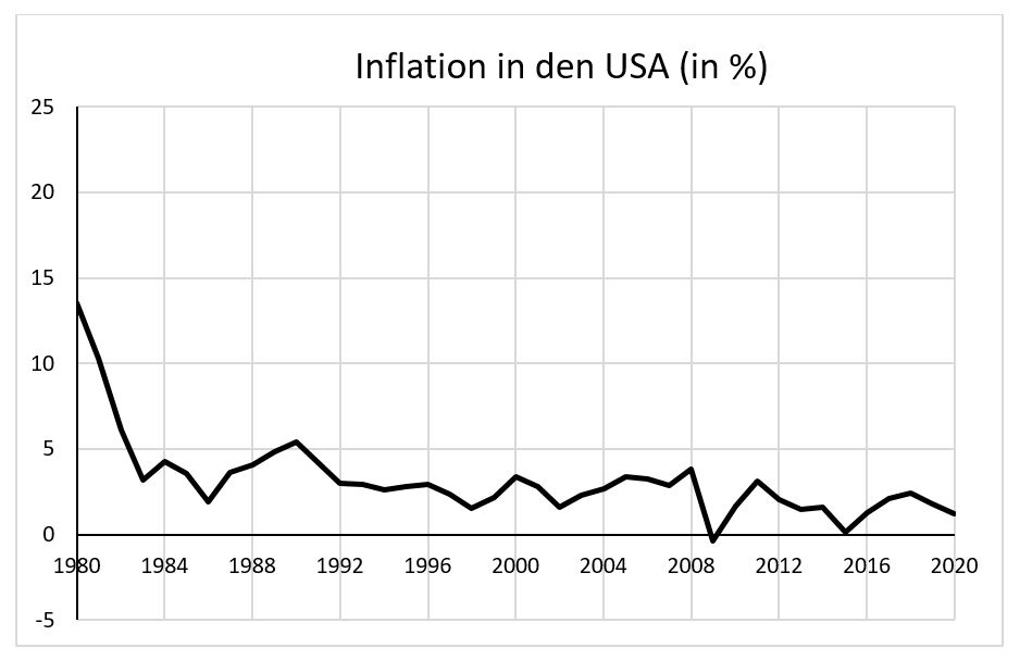 Eine detaillierte Beurteilung dieser Position der gezügelten Inflation würde hier zu weit führen. Allerdings ist ein etwas weiter gefasster Blick auf die Entwicklung über die Jahrzehnte instruktiv. Hilfreich ist beispielsweise ein Blick auf die US-amerikanische Inflationsrate. In der letzten der drei grafischen Darstellungen sehen wir die Inflationsentwicklung in den USA von 1980 bis 2020. Diese Darstellung dokumentiert, dass über diese vier Jahrzehnte die Inflation in den großen Industrieländern allgemein eine sinkende Tendenz zeigt. Der verbreitete internationale Rückgang der Inflation hatte verschiedene Gründe. Wichtig war dabei gewiss die in den 1970er-Jahren gewonnene Einsicht, dass mit höherer Inflation nicht dauerhaft niedrige Arbeitslosigkeit 'erkauft' werden kann.