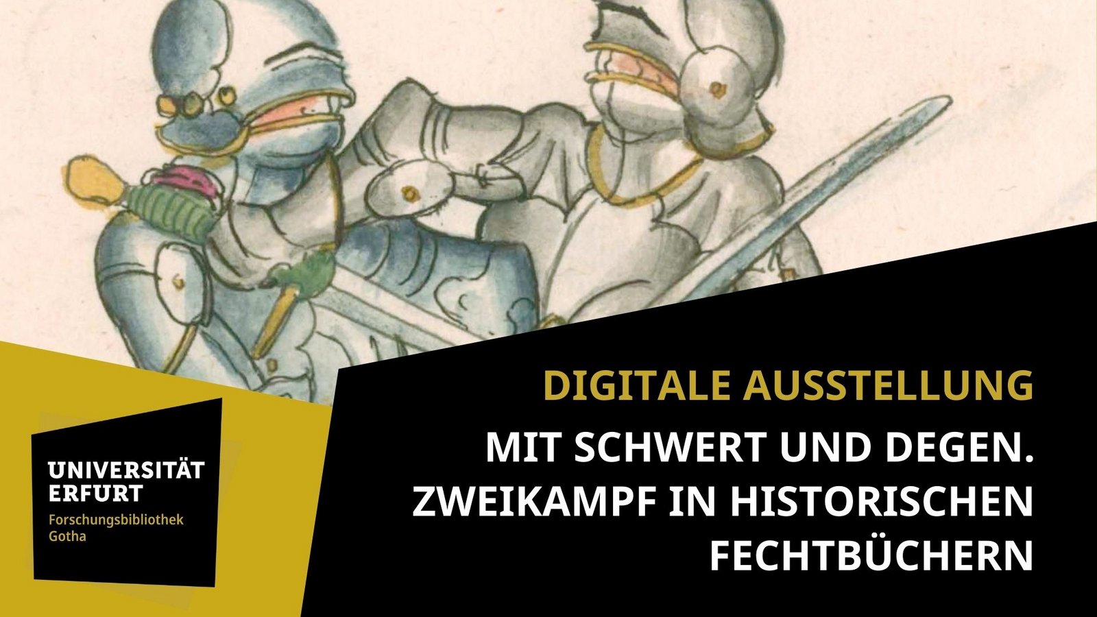 Bis zum Zweiten Weltkrieg besaß die heutige Forschungsbibliothek Gotha auf Schloss Friedenstein eine außerordentlich umfangreiche Fechtbuchsammlung. Den Kern bildeten fünf illustrierte spätmittelalterliche Handschriften von Hans Talhoffer, Paulus Kal und zwei unbekannten Fechtmeistern, darunter das älteste überlieferte Fechtbuch Europas (heute Royal Armouries in Leeds, I.33). Zu welchem Zweck wurden diese Kampfkunstkompendien erstellt, wie wurden Körpertechniken vermittelt, wie entstand die unikale Sammlung in Gotha und welche Rolle spielte sie in der modernen Zeit bei ihrer Entdeckung für die Rechts-, Kunst- und Sportgeschichte Deutschlands sowie für die heutige sehr lebhafte Bewegung zur Rekonstruktion der historischen Kampfkünste? In der Ausstellung werden diese und viele anderen Fragen anhand von bebilderten Handschriften und Alten Drucken erläutert.