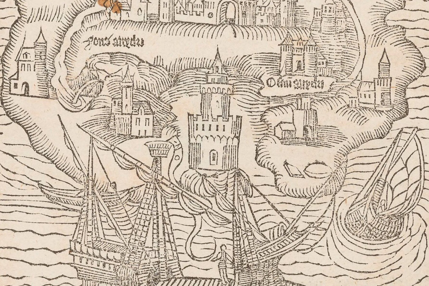 Abb.: Holzschnitt, 1516, Utopia, Thomas More, 1516 gedruckt von Dirk Martens, Bibliothèque Nationale de France, Public domain, via Wikimedia Commons.