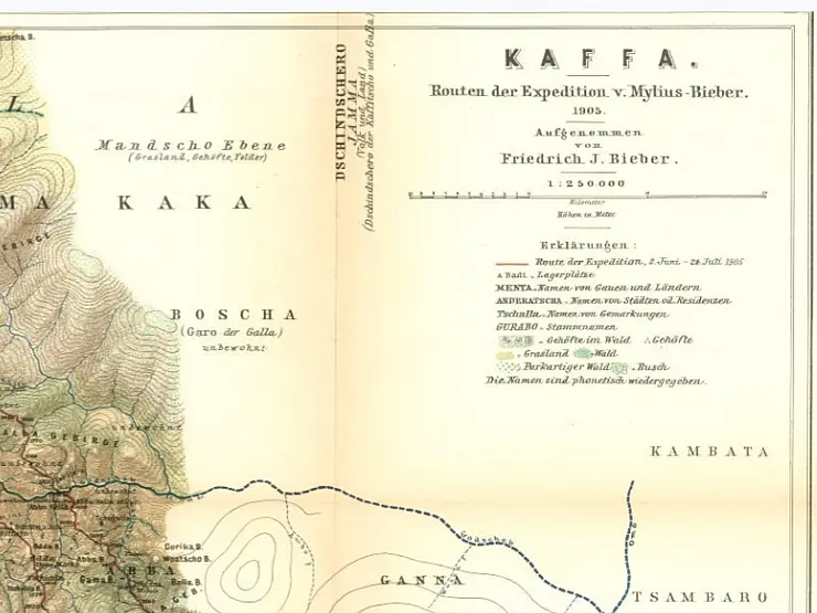 Bild: Detail of Julius Friedrich Bieber, Kaffa. Routen der Expedition v. Mylius–Bieber, 1905, in: Dr. A. Petermann's Mitteilungen aus Justus Perthes' Geographischer Anstalt 54 (1908), Tafel 10.