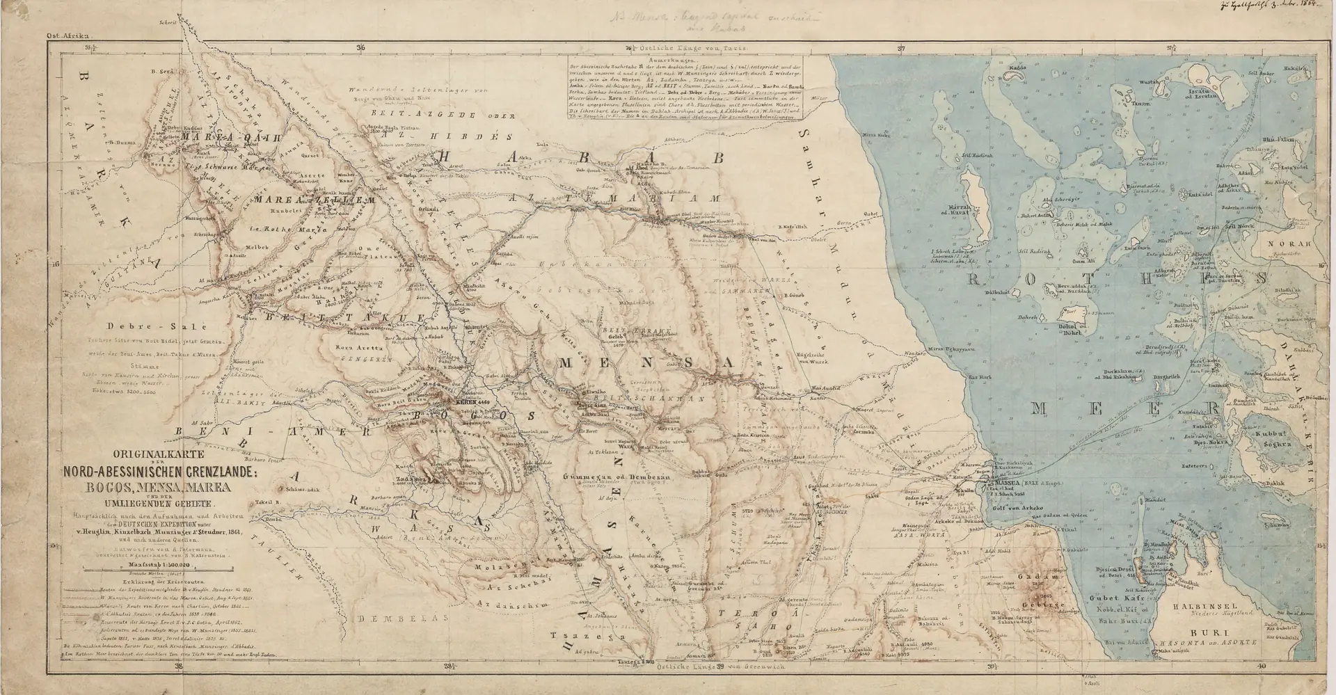 Bild: Bruno Hassenstein, Originalkarte der nord-abessinischen Grenzlande,Maßstab: 1 : 500.000, 1864 © Sammlung Perthes / Forschungsbibliothek Gotha, SPK 547-112085962.