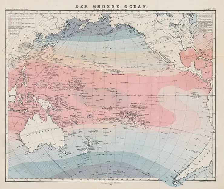 Bild: August Petermann, Der grosse Ocean, Mitteilungen aus Justus Perthes‘ Geographischer Anstalt, [3] (1857), Tafel 1. © Forschungsbibliothek Gotha, SPA 4°000100.