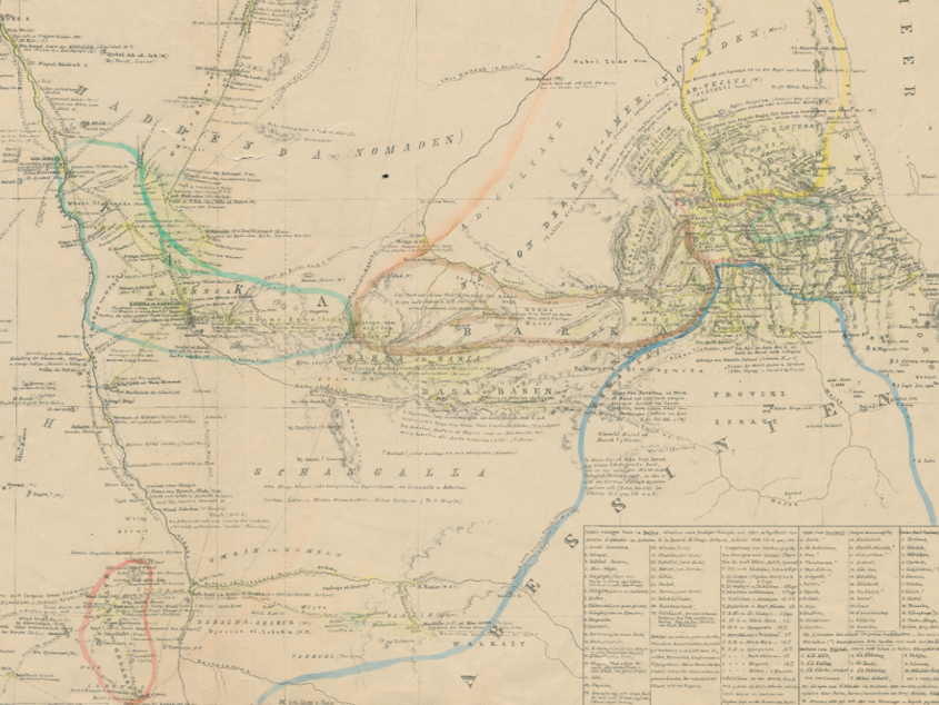 Bild: © August Petermann, Entwurf einer Karte. Ost-Afrika zwischen Chartúm & dem rothen Meere bis Sauakin & Massua, 1:1.000.000, Gotha 1860/61, SPK 40.19.01 C (01), Sammlung Perthes der Forschungsbibliothek Gotha