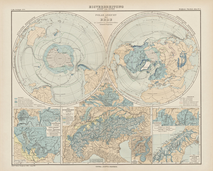 Bild: Eisverbreitung, einst und jetzt. Polar Ansicht der Erde in Lambert’s flachenrechter Azimuthal-Projection, in: Berghaus’ Physikalischer Atlas, Nr. 5, Gotha 1892.
