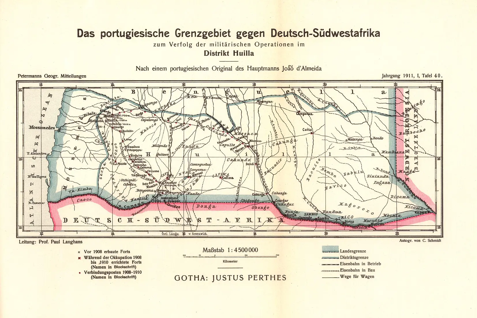 Paul Langhans, Das portugiesische Grenzgebiet gegen Deutsch-Südwestafrika. Zum Verfolg der militärischen Operationen im Distrikt Huilla, in: Dr. A. Petermann's Mitteilungen aus Justus Perthes' Geographischer Anstalt 57 (1911), Tafel 40.