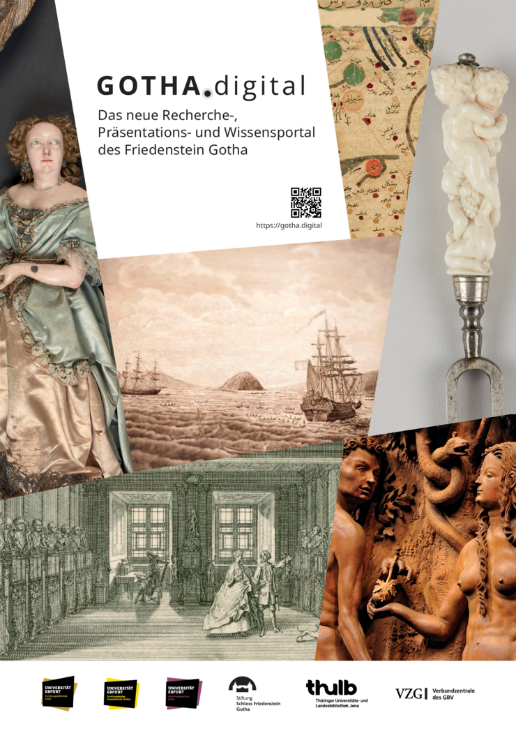 Auf Schloss Friedenstein und im Perthes-Forum Gotha haben sich außerordentliche Sammlungen in ihrem historisch überlieferten Zusammenhang erhalten. Sie wurden seit 1640 zusammengetragen und werden heute von der zur Universität Erfurt gehörenden Forschungsbibliothek Gotha, dem Landesarchiv Thüringen – Staatsarchiv Gotha und der Stiftung Schloss Friedenstein Gotha betreut. Die Sammlungen sind in ihrer Geschlossenheit, Überlieferungsdichte und Vielfalt herausragend. Sie bilden die Grundlage für die Aktivitäten des Sammlungs- und Forschungsortes Gotha. GOTHA.digital ist der integrierte Such-, Präsentations- und Forschungsraum des Friedenstein Gotha. Das Portal führt die digitalen Objekte, Sammlungen und Angebote aus Archiv, Bibliothek, Museum sowie des Forschungskollegs Transkulturelle Studien / Sammlung Perthes und des Forschungszentrums Gotha zusammen. GOTHA.digital ermöglicht die sammlungs- und institutionenübergreifende Suche und kuratierte Sammlungseinblicke für Wissenschaft und Öffentlichkeit.