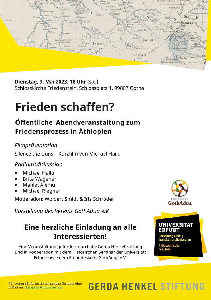 Alle Interessierten waren herzlich zu einer Podiumsdiskussion eingeladen, die am 09. Mai 2023 um 18:00 Uhr (s.t.) in der Schlosskirche von Schloss Friedenstein in Gotha stattfand. Hintergrund war der äthiopische Bürgerkrieg sowie der jüngst begonnene Friedensprozess. Auf dem Podium diskutierten der äthiopische Künstler Michael Hailu, die ehemalige deutsche Botschafterin in Äthiopien Brita Wagener, Dr. Alula Tesfay und der Erfurter Völkerrechtler Michael Riegner die Frage „How to build peace?“ - Die Veranstaltung war Teil der Vortragsreihe "Frieden schaffen" des Historischen Seminars der Universität Erfurt sowie der 2. Jahrestagung der Deutsch-äthiopischen Stipendieninitiative. Sie wurde gefördert durch die Gerda Henkel Stiftung sowie durch den Freundeskreises GothAdua e.V.
