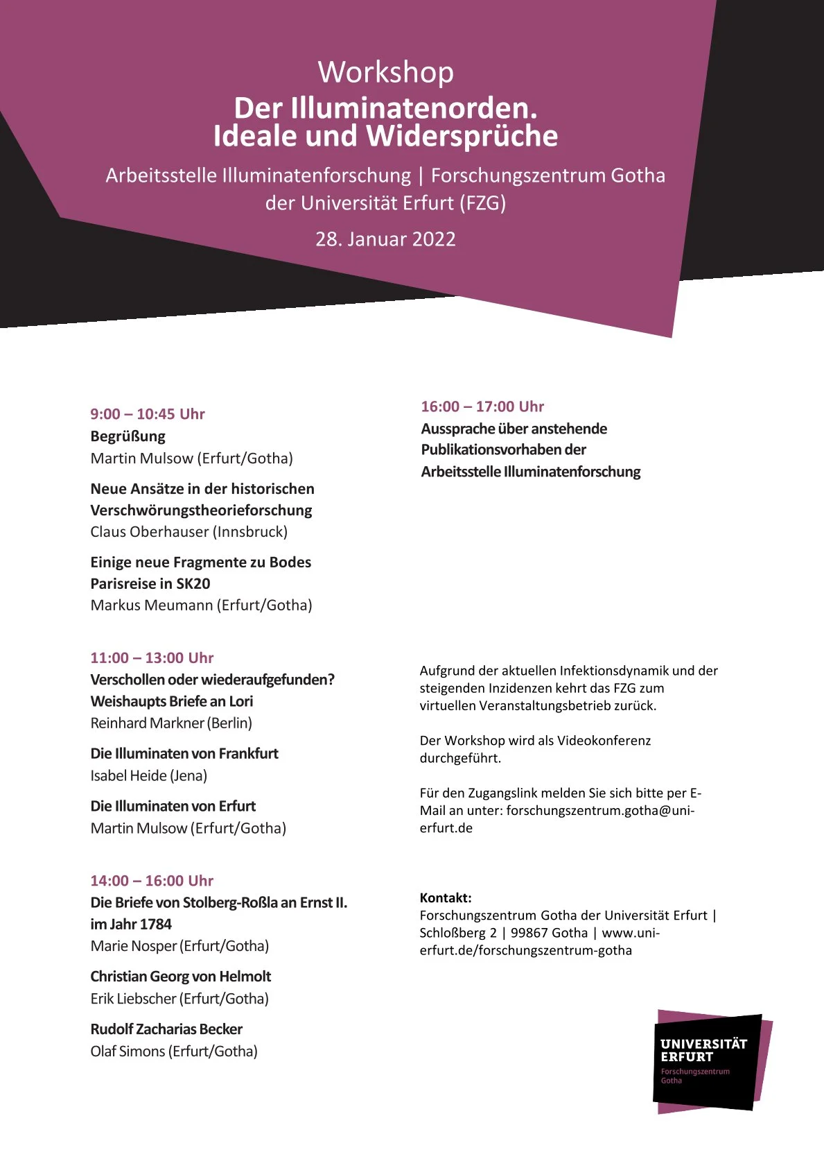 2022 „Der Illuminatenorden. Ideale und Widersprüche”. Workshop der Arbeitsstelle für Illuminatenforschung am Forschungszentrum Gotha, 28. Januar 2022; auswärtiger Gast: Dr. Claus Oberhauser (Innsbruck)