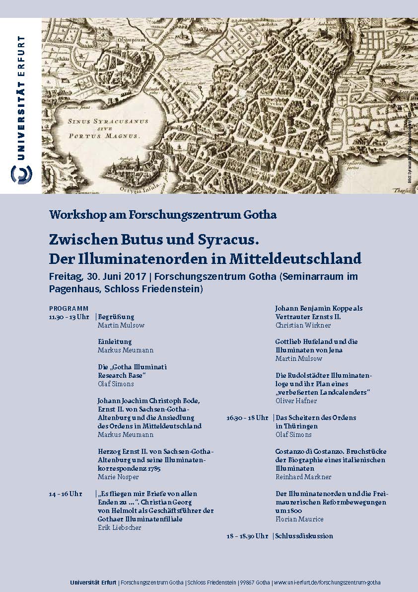 Markus Meumann: “Johann Joachim Christoph Bode, Ernst II. von Sachsen-Gotha-Altenburg und die Ansiedlung des Ordens in Mitteldeutschland”, Vortrag beim Workshop “Zwischen Butus und Syracus. Der Illuminatenorden in Mitteldeutschland”, Gotha, 30. Juni 2017.