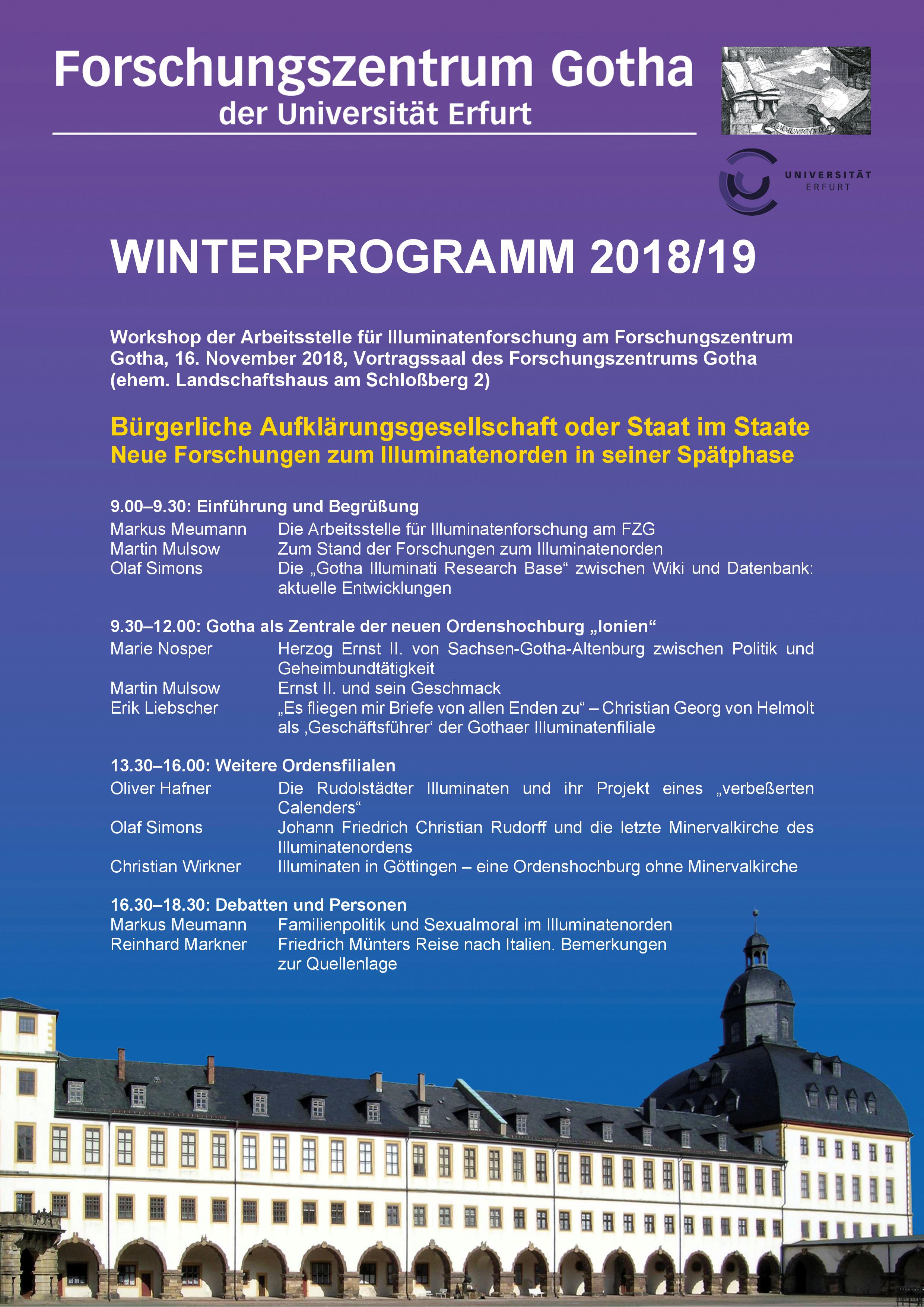 2018 „Bürgerliche Aufklärungsgesellschaft oder Staat im Staate. Neue Forschungen zum Illuminatenorden in seiner Spätphase“. Workshop der Arbeitsstelle Illuminatenforschung am Forschungszentrum Gotha, 16. November 2018