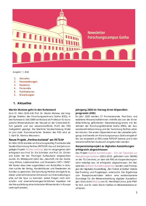 Zum Beginn des Sommersemesters 2026 informiert der gemeinsame Newsletter der Forschungsbibliothek Gotha, des Forschungskollegs Transkulturelle Studien/Sammlung Perthes sowie des Forschungszentrums Gotha über aktuelle Projekte, geplante Veranstaltungen und Publikationen.