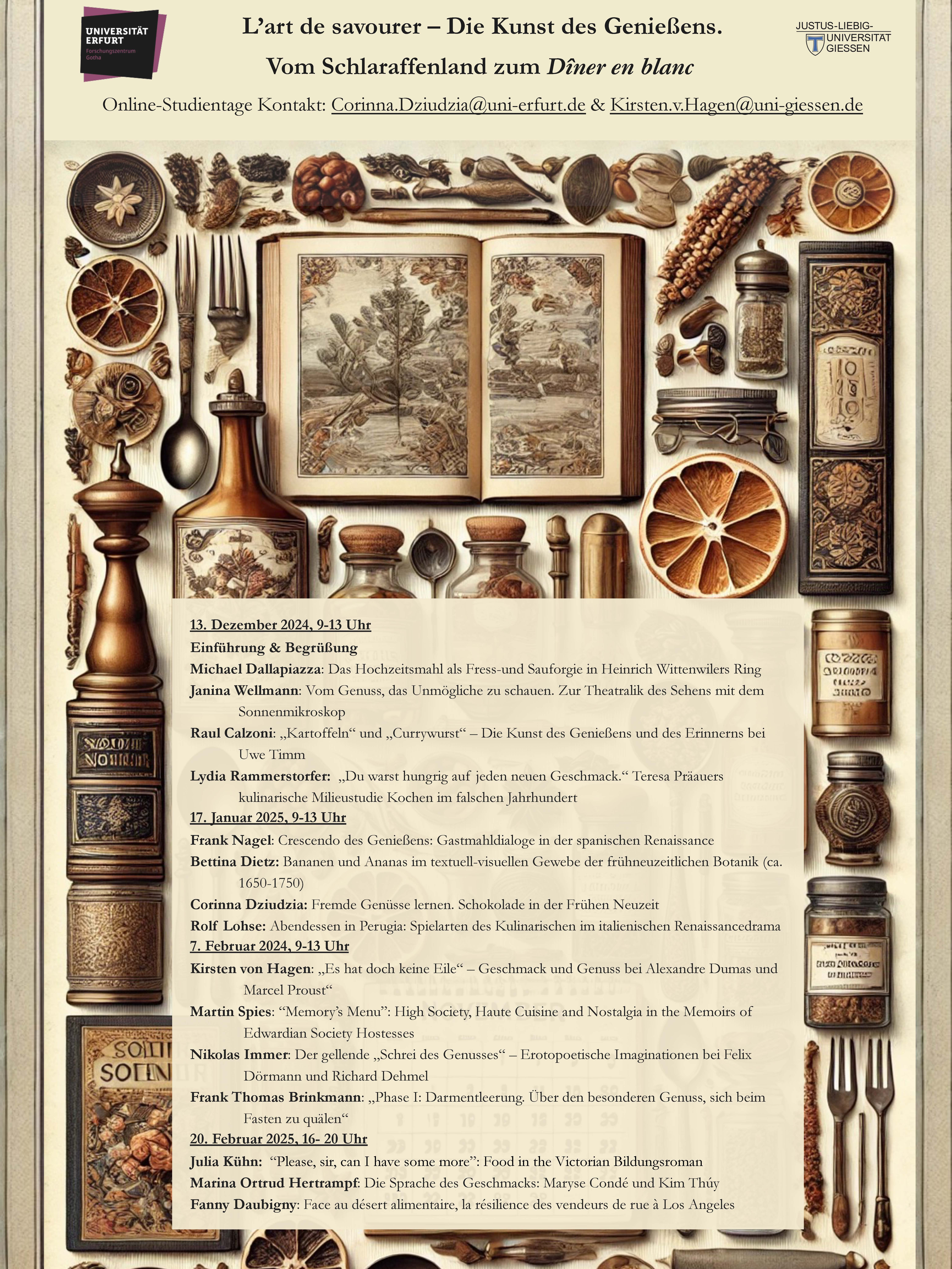 Unter der Leitung von Dr. Corinna Dziudzia (Erfurt/Gotha) und Prof. Dr. Kirsten von Hagen (Gießen) fanden via vier virtuelle Studientage (02.11. & 14.12.23 und 11.01. & 15.02.24) statt.