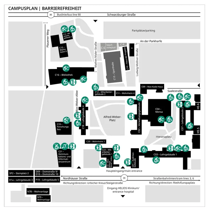 Grundsätzlich sind alle Lehrgebäude für Rollstuhlfahrer zugänglich. Bei Lehrveranstaltungen sind wir bemüht Ihnen die Lehrveranstaltungen im Erdgeschoss zugänglich zu machen. Hierfür sollten Sie uns frühzeitig Ihre Stundenplanung zuleiten, damit wir diese im Dezernat 1bei der Raumvergabe berücksichtigen können.