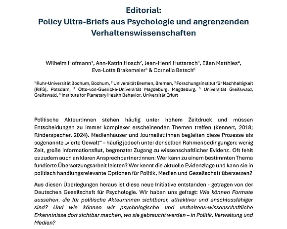 Die Policy Ultra Briefs sind eine Initiative der Deutschen Gesellschaft für Psychologie (DGPs). Sie werden von Expert:innen aus Wissenschaft und Praxis verfasst, durchlaufen ein Peer-Review-Verfahren und sind speziell auf die Bedürfnisse politischer Praxis zugeschnitten.