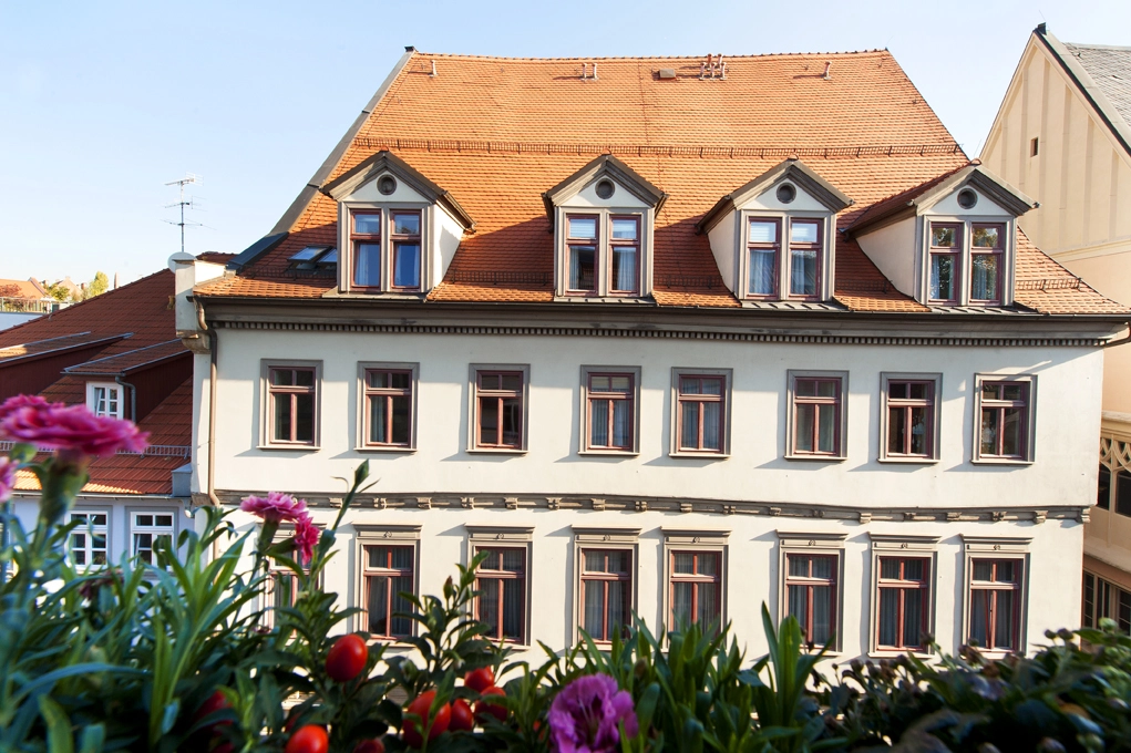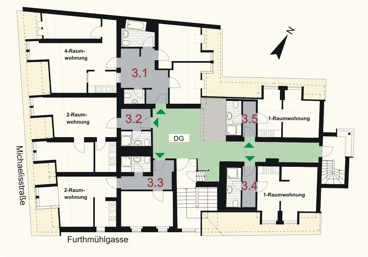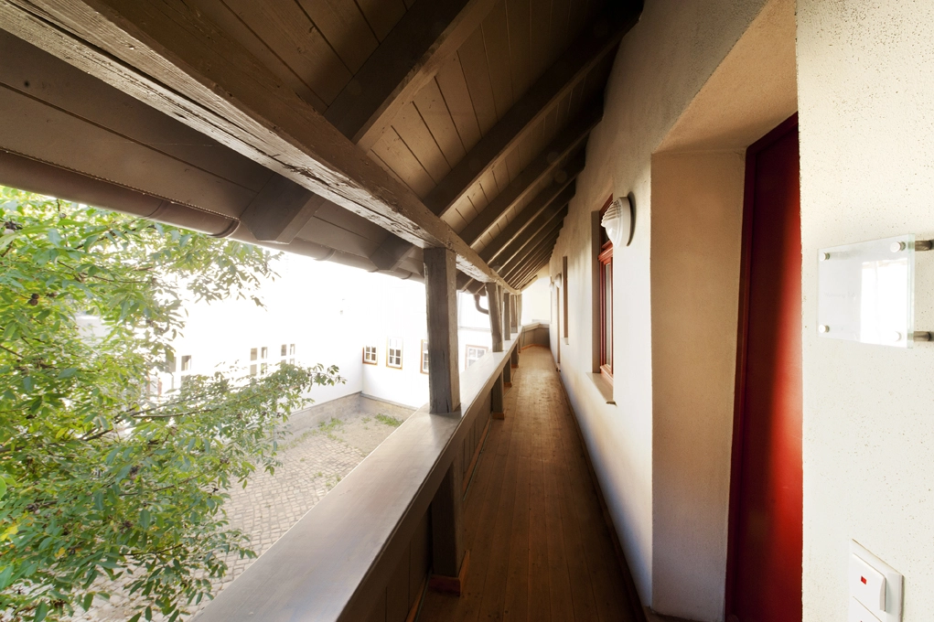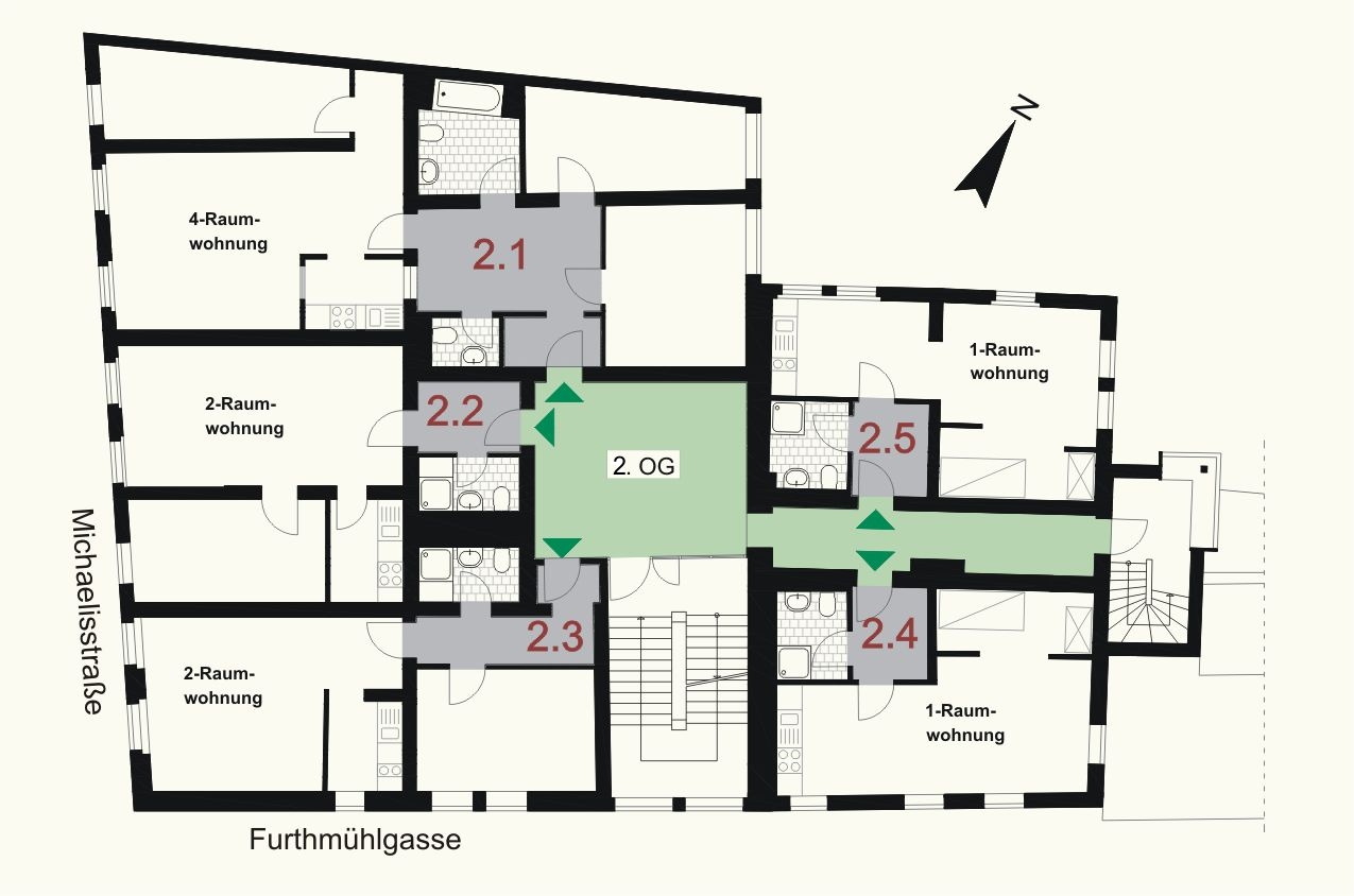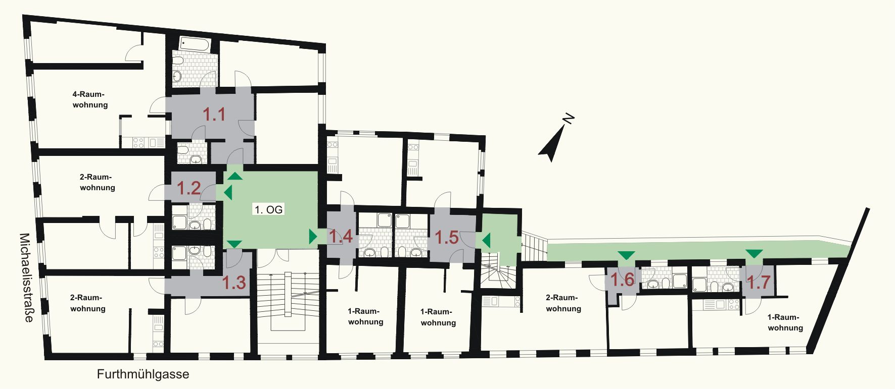 In den drei Wohngeschossen des Haupthauses und im Obergeschoss des Nebengebäudes (Erschließung über einen Laubengang) befinden sich insgesamt 17 Wohnungen. Die Gesamtwohnfläche von rund 770m² verteilt sich auf unterschiedlich große Wohnungen. Zur Auswahl stehen drei Vierraum-, sieben Zweiraum- und sieben Einraumwohnungen.